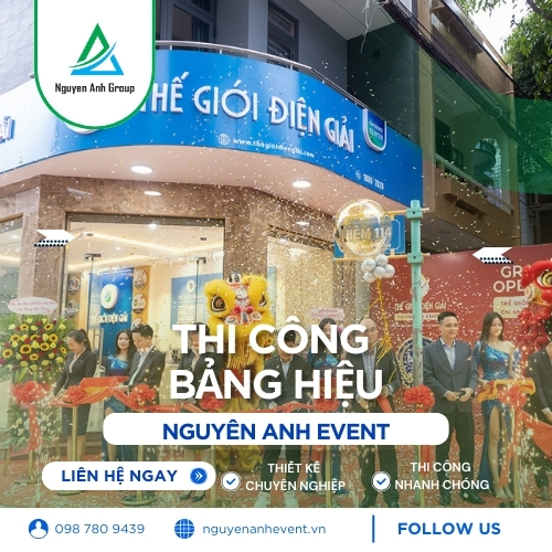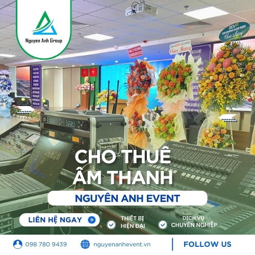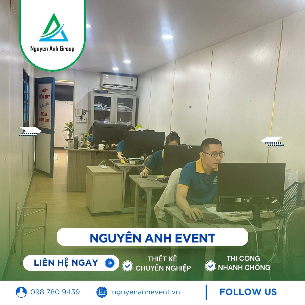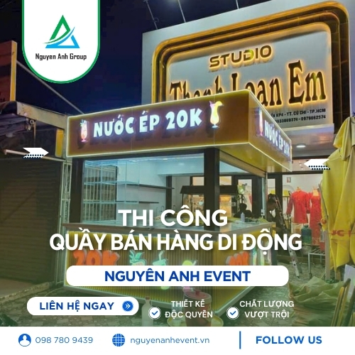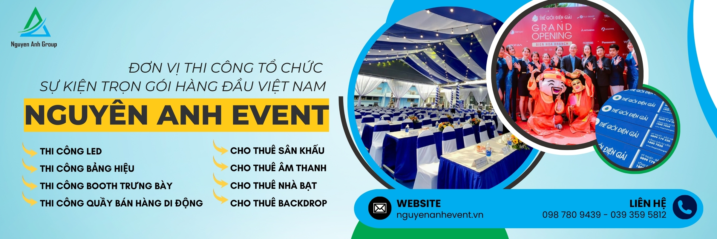 Nguyên Anh Event là đơn vị thiết kế – thi công – tổ chức sự kiện trọn gói chuyên nghiệp. Chúng tôi cho thuê sân khấu, cho thuê âm thanh ánh sáng, cho thuê nhà bạt không gian, cho thuê backup – trang trí bong bóng, thi công trọn gói showroom, quán ăn, quán trà sữa,… đáp ứng mọi đối tượng khách hàng từ chủ đầu tư cá nhân đến doanh nghiệp lớn khắp Việt Nam. Khách hàng có thể liên hệ đến chúng tôi để nhận tư vấn giải pháp thiết kế và thi công bảng quảng cáo, bảng hiệu, quầy bán hàng,… giúp thương hiệu trở nên nổi bật, thu hút vô số khách hàng đến tìm hiểu sản phẩm/dịch vụ.